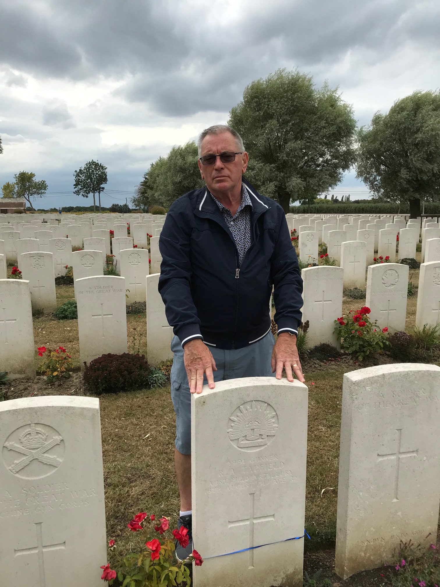 At the grave in China Wall/Perth cemetery in Flanders at the grave of the man whose death was witnessed by my Australian relative Fred Barrah in 1917.